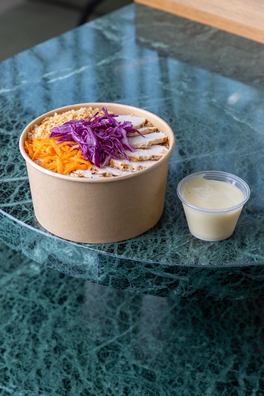 quinoa, grilled chicken, mixed cabbage, carrots, spinach and toasted peanuts.